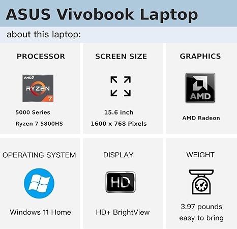 ASUS 2023 Newest Vivobook Laptop, 16 HD Display, AMD Ryzen 7 5800HS (8 core, Beats i7-1195G7), 12GB RAM, 512GB SSD, AMD Radeon Graphics, WiFi 6, Chiclet Keyboard, USB-A&C, Windows 11 Home