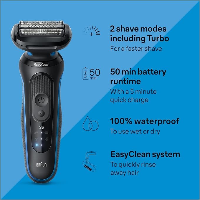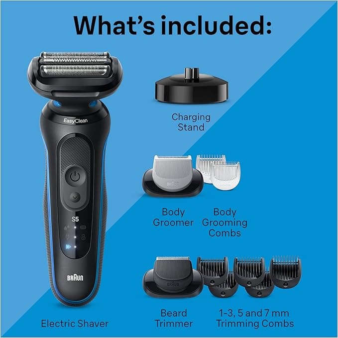 Braun Electric Shaver for Men, Series 5 5150cs, Wet & Dry Shave, Turbo Shaving Mode, Foil Shaver, with Beard Trimmer, Body Groomer and Charging Stand, Blue