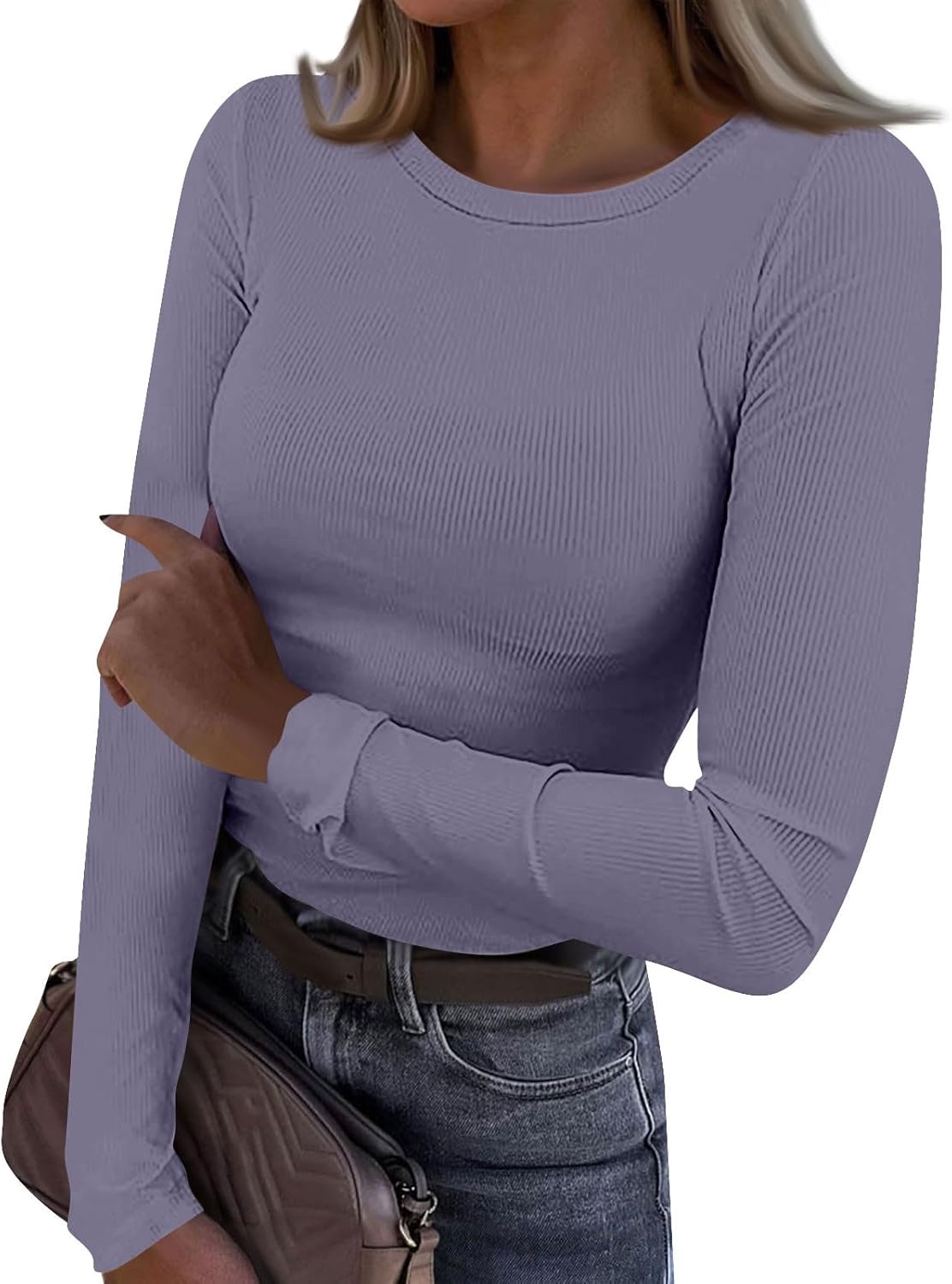 Going Out Tops for Women Fall Ribbed Crew Neck Shirts Long Sleeve Lightweight Tops Winter Trendy Travel Clothes