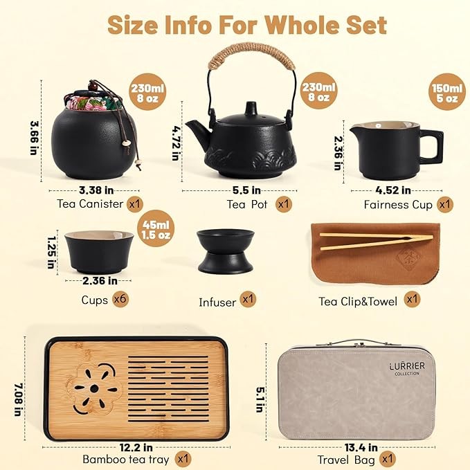 LURRIER Gongfu tea sets, Portable Ceramic TeaSet, Asian Tea sets for adult, Tea Gift sets, Grey leather case, Portable Travel Bag,Home,Gifting,Outdoor and Office(Black)