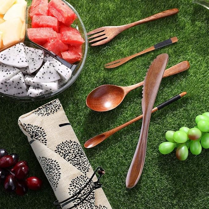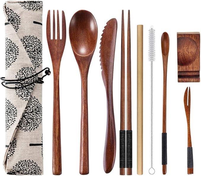 OKA Reusable Wooden Travel Cutlery Set Japanese Style Lunch Utensil Set with Case ,9 Pcs Wooden Flatware Including Reusable Knife Fork Spoon Chopsticks Straws & Cleaning Brush