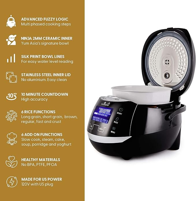 Yum Asia Sakura Rice Cooker with Ceramic Bowl and Advanced Fuzzy Logic (8 Cup, 1.5 Litre) 6 Rice Cook Functions, 6 Multicook Functions, Motouch LED Display, 120V Power (Black and Silver)