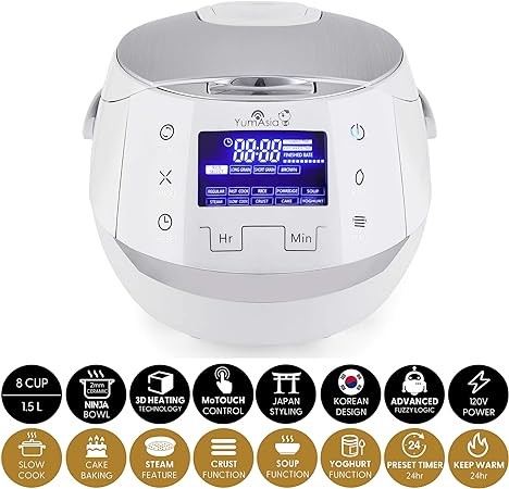 Yum Asia Sakura Rice Cooker with Ceramic Bowl and Advanced Fuzzy Logic (8 Cup, 1.5 Litre) 6 Rice Cook Functions, 6 Multicook Functions, Motouch LED Display, 120V Power (White and Siver)
